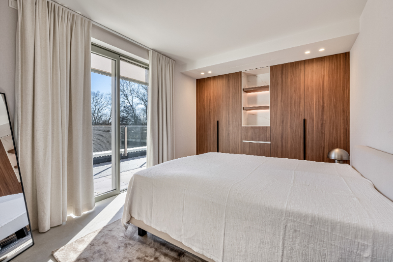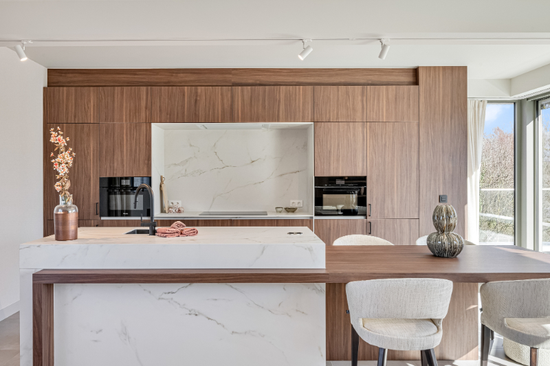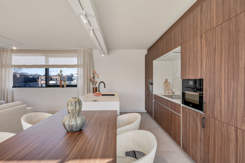 De keuken is uitgerust met hoogwaardige toestellen van Miele (combi stoomoven en combi micro-oven), volledig geïntegreerde kasten en slimme en verborgen opbergruimtes. Het open ontwerp en de subtiele afwerking geven de ruimte een stijlvolle en serene uitstraling. De kastenwand met open haard in de leefruimte zorgt meteen voor sfeer en gezelligheid.